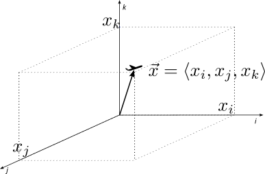 Within most texts on classical mechanics, and this one being no exception, a Cartesian coordinate system is more common for modelling kinematics scenarios. A Cartesian coordinate system (Figure 1.2) defines three orthogonal axes \(i\), \(j\) and \(k\), which all intersect at the origin. A point \(P\) in this space can be represented by the position vector \(\vec{P} = \langle x_i, x_j, x_k \rangle\), where \(x_i\), \(x_j\) and \(x_k\) represent the projections of the point \(P\) on the \(i\), \(j\) and \(k\) axes, respectively.