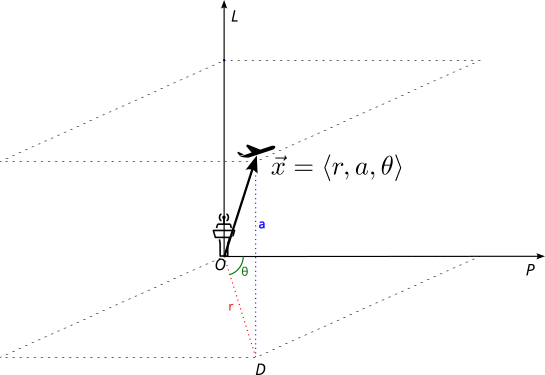 In this scenario, a 3-dimensional cylindrical coordinate system has been chosen. Such a system requires specifying an origin at which two axes — the polar and longitudinal axes — intersect. Let the control tower be the origin \(O\), and let the polar axis \(P\) be the line that is drawn from the control tower due north. The longitudinal axis \(L\) will be the line perpendicular to the Earth's surface, emerging from \(O\). Any aircraft position may now be represented with a position vector \(\vec{x} = \langle r, a, \theta \rangle \). The length \(r\) represents the radial distance from the control tower to the point on the ground directly underneath the aircraft, designated by the point \(D\). The length \(a\) represents the altitude or height of the aircraft above the ground. Finally, the angle \(\theta\) is the clockwise-positive angle subtended between the line \(OD\) and the axis \(A\). We will assert the lengths \(a\) and \(r\) be measured in meters, and \(\theta\) to be measured in degrees. If the aircraft in the diagram is 6km northwest of the control tower at a height of 5000 meters, the position vector \(\vec{x}\), represented by the black arrow, will have the value \(\langle 6000\text{m}, 5000\text{m}, 45° \rangle \).